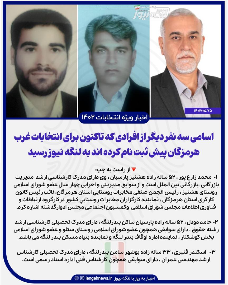 ▫️به گزارش لنگه نیوز ، طبق اطلاعات رسیده به لنگه نیوز، اسامی سه نفر از داوطلبانی که در دوازدهمین دوره انتخابات مجلس شورای اسلامی در حوزه غرب هرمزگان ، ثبت نام کرده اند به لنگه نیوز رسیده است.